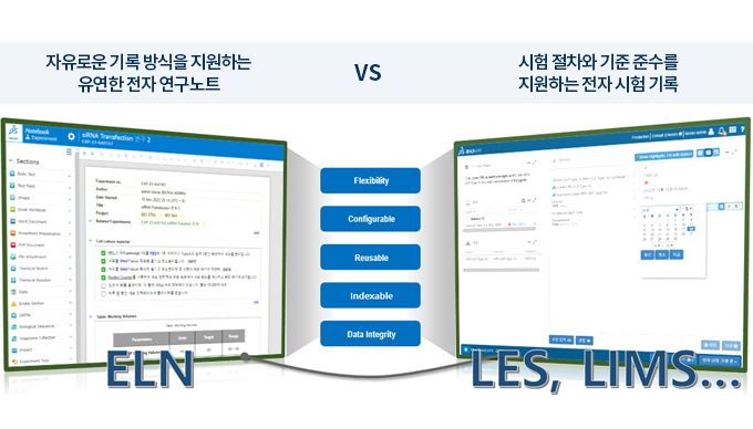 BIOVIA ONE Lab은 기존의 자유로운 기록 방식을 유지하면서 디지털화하는 유연한 전자연구노트와 시험 절차를 준수하는 기록 방식의 전자 시험 기록 시스템(LES)이 유기적으로 연결되어