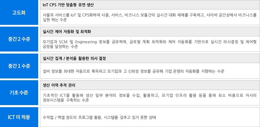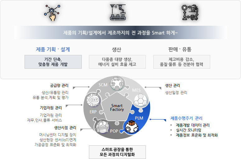 Smart Factory는 정부지원 사업으로써 제품의 기획부터 판매까지 모든 과정을 ICT(정보통신기술)로 통합하여