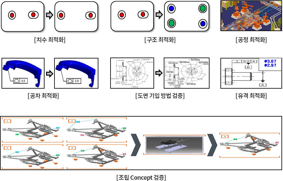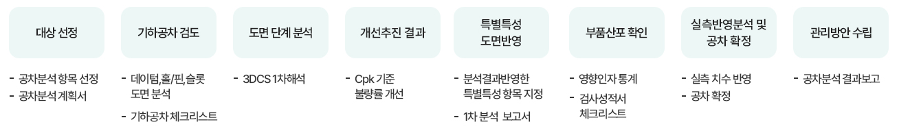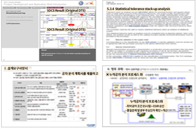 전세계에서 가장 많이 사용되는 공차해석 소프트웨어인 3DCS를 활용하여 제품의 품질 산포, 간섭, 조립불량을 사전에 예측하고